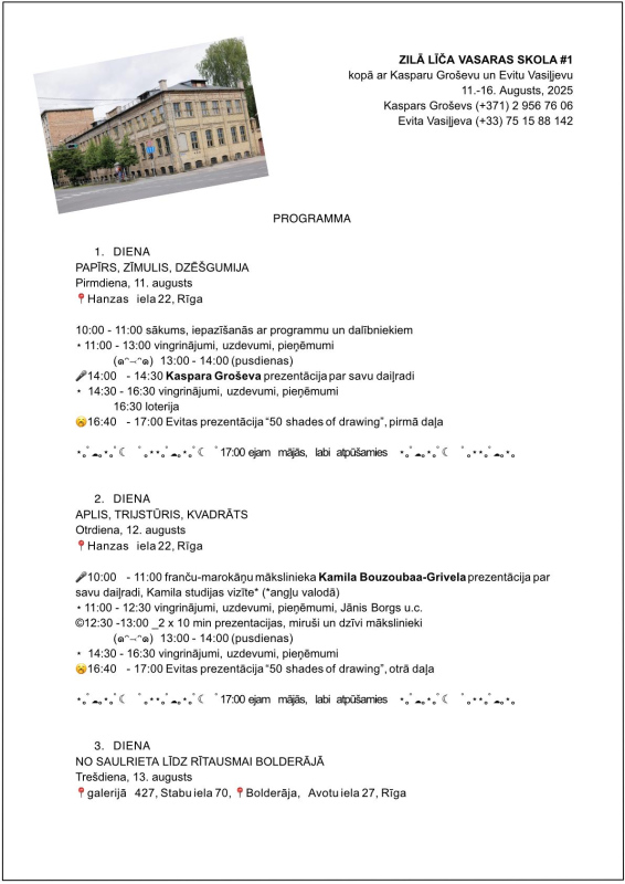 In 2025, together with artist Kaspars Groševs, Evita Vasiljeva established a new experimental summer school in Riga, Latvia : Blue Lagoon Summer School (Zilā Līča Vasaras Skola).