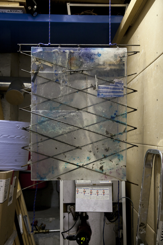 Soap Opera II (yellow), 2019 Soap, steel rods, screws, cable ties, pigments, laser prints on plastic, paper, flies from Latvia, painkiller pills, matches, wires, chocolate